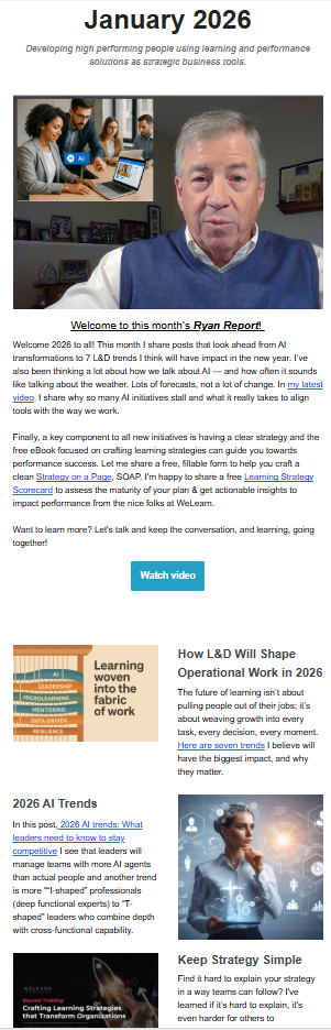 And because every new initiative needs a solid foundation, I’m sharing a few free resources to help you build or refine your learning strategy. In this month’s Ryan Report You’ll find links to a free Learning Strategy eBook, a fillable Strategy‑on‑a‑Page (SOAP) template, and a Learning Strategy Scorecard generously provided by the team at WeLearn. Each one is designed to help you get clearer, more confident, and more intentional about the year ahead.