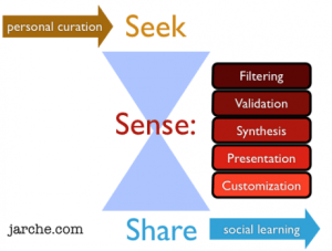 I wrote about our personal learning networks (#LearningPersonally) earlier and must admit a high degree of comfort in Jarche’s  model.  This reminds me of Blooms taxonomy original and new domains with the concept of sharing being one based upon synthesis, analysis, and creation of content.  Key to all of this is the critical thinking component and being able to filter selectively and customize the content you need when you need it.  From that point you are going through the process of making sense out of all of this information.