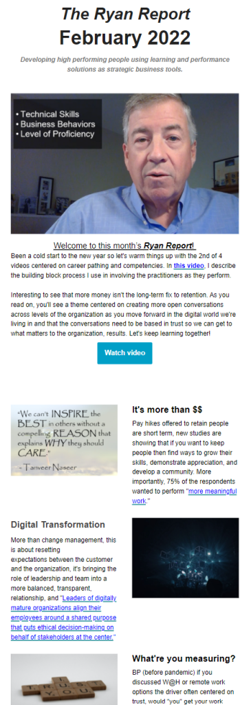 Welcome to this month’s Ryan Report filled with news to use and ideas to share. This month I share the 2nd of 4 videos as I outline the reasons to develop career paths and use competencies to create a connection between professional development and the business criteria in a role that leads to performance success. In this video, I describe the building block process I use in involving the practitioners as they perform. I also found that money isn’t the long-term fix to retention, there’s a theme centered on creating more open conversations across levels of the organization as you move forward in the digital world we’re living in and that the conversations need to be based in trust so we can get to what matters to the organization, results.