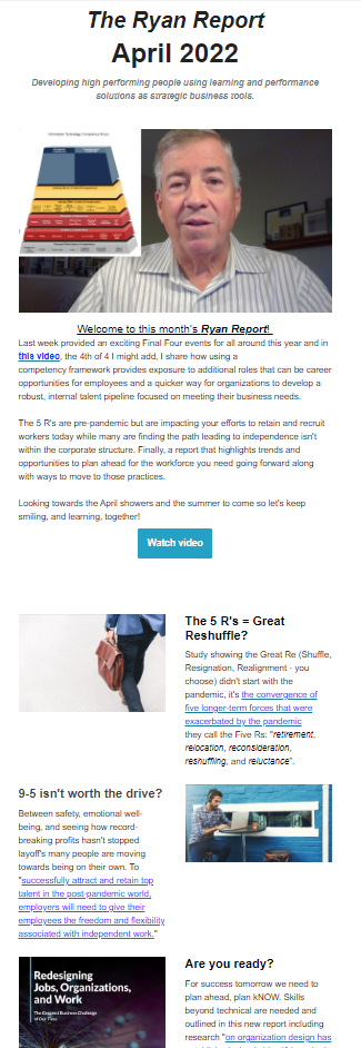 We are certainly seeing April showers where I am and this month’s Ryan Report, I bring ideas that may bloom for you! In this video, the 4th of 4 I might add, I share how using a competency framework provides exposure to additional roles that can be career opportunities for employees and a quicker way for organizations to develop a robust, internal talent pipeline focused on meeting their business needs.