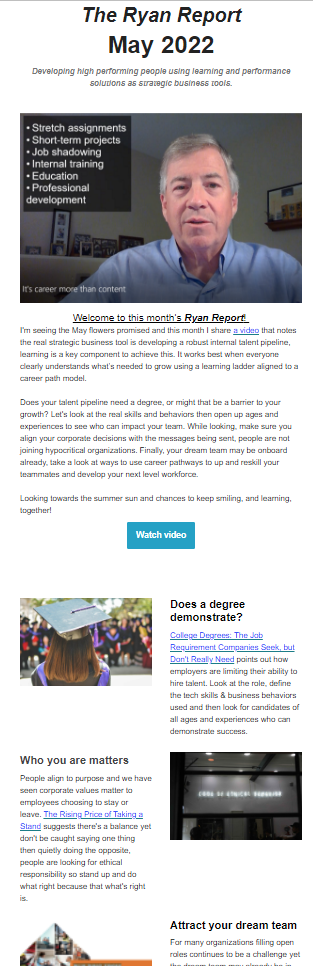 Summer is close by as I share the May issue of The Ryan Report with news to use & ideas to share. Check out a short video where i highlight the real strategic business tool is developing a robust internal talent pipeline, learning is a key component to achieve this (and how you can create the magic!). Does your talent pipeline require a degree to enter, or might that be a barrier to your growth? While we’re thinking that out take some time to explore your process to make sure you align your corporate decisions with the messages being sent to internal adn external stakeholders, how we act has value in new ways. Finally, I look at ways to you can use career pathways to up and reskill your team. The time is “kNOW” to develop your next level workforce!