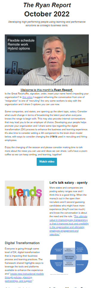 Is the Great Re(shuffle, signation, order, insert your name here!) impacting your organization? In this issue of The Ryan Report, I share a video I suggest reframing the conversation from one of “resignation” to one of “recruiting” the very same workers to stay with the organization and I share 3 options you can use now.