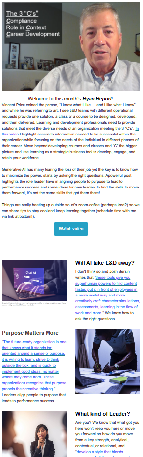 Vincent Price coined the phrase, “I know what I like … and I like what I know” and while he was referring to art, I see L&D teams with different operational requests provide one solution, a class or a course to be designed, developed, and then delivered. Learning and development professionals need to provide solutions that meet the diverse needs of an organization meeting the 3 “C’s”. In this video I highlight access to information needed to be successful within the organization while focusing on the needs of the individual in different phases of their career. Move beyond developing courses and classes and “C” the bigger picture and use learning as a strategic business tool to develop, engage, and retain your workforce.