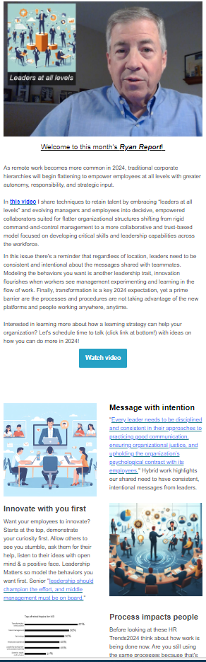 In this video I share techniques to retain talent by embracing “leaders at all levels” and evolving managers and employees into decisive, empowered collaborators suited for flatter organizational structures shifting from rigid command-and-control management to a more collaborative and trust-based model focused on developing critical skills and leadership capabilities across the workforce. In this issue there’s a reminder that regardless of location, leaders need to be consistent and intentional about the messages shared with teammates. Modeling the behaviors you want is another leadership trait, innovation flourishes when workers see management experimenting and learning in the flow of work. Finally, transformation is a key 2024 expectation, yet a prime barrier are the processes and procedures are not taking advantage of the new platforms and people working anywhere, anytime.