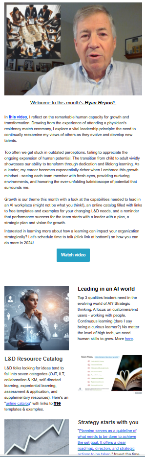 Growth is our theme this month with a look at the capabilities needed to lead in an AI workplace (might not be what you think!), an online catalog filled with links to free templates and examples for your changing L&D needs, and a reminder that performance success for the team starts with a leader with a plan, a strategic plan and vision for growth.