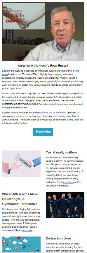 Other shares this month highlight the need to keep recruiting your people from the moment they accept the offer, engage to retain! An observation prompted by the just completed Olympics, when we widen the mat, we discover champions we never knew existed. And ideas to help keep your team focused during the summer daze.