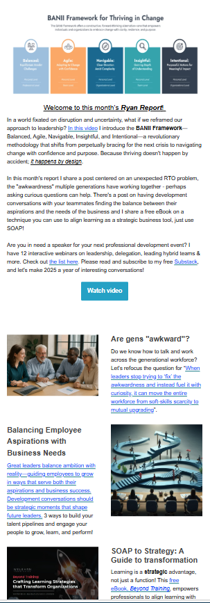 In this month’s Ryan Report I share a post centered on an unexpected RTO problem, the “awkwardness” multiple generations have working together – perhaps asking curious questions can help. There’s a post on having development conversations with your teammates finding the balance between their aspirations and the needs of the business and I share a free eBook on a technique you can use to align learning as a strategic business tool, just use SOAP!