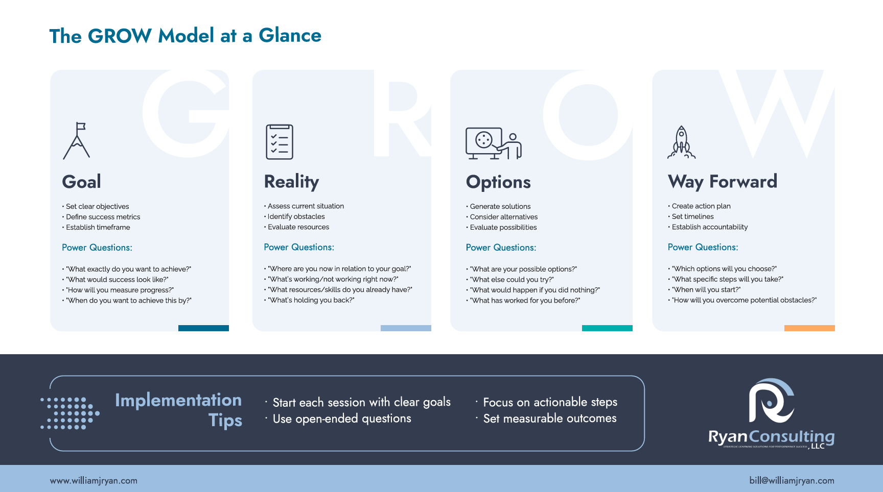 - A clear breakdown of the GROW Framework and how to apply it in real-world leadership scenarios