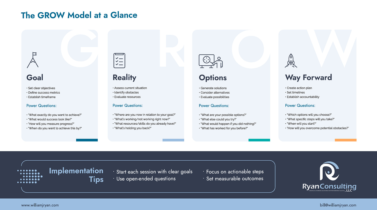 In today’s hybrid, fast-moving workplaces, leaders need more than intuition—they need structure. But that structure must be flexible enough to honor the human side of leadership. That’s what GROW offers: a way to lead with clarity and compassion, without losing strategic focus.
