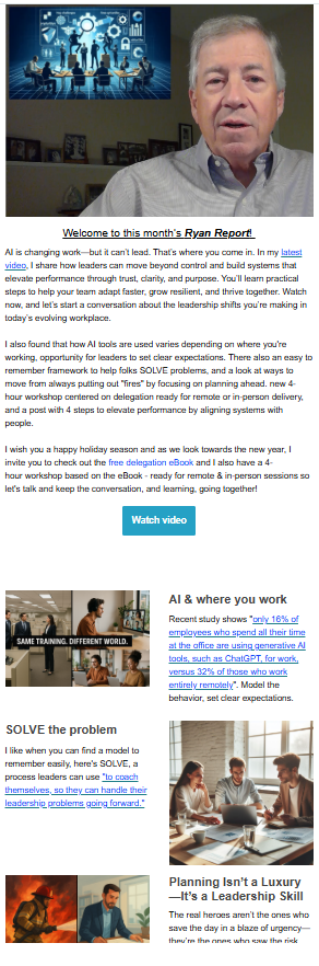 As I’ve been working with different teams, one thing has become clear: the way AI tools are used varies widely from workplace to workplace. That creates a real opportunity for leaders to set expectations, reduce confusion, and guide people toward healthy, productive use of these tools. In this month’s Ryan Report, I introduce a simple, memorable framework to help teams SOLVE problems more effectively, along with strategies to move beyond constant “firefighting” by planning ahead with intention.